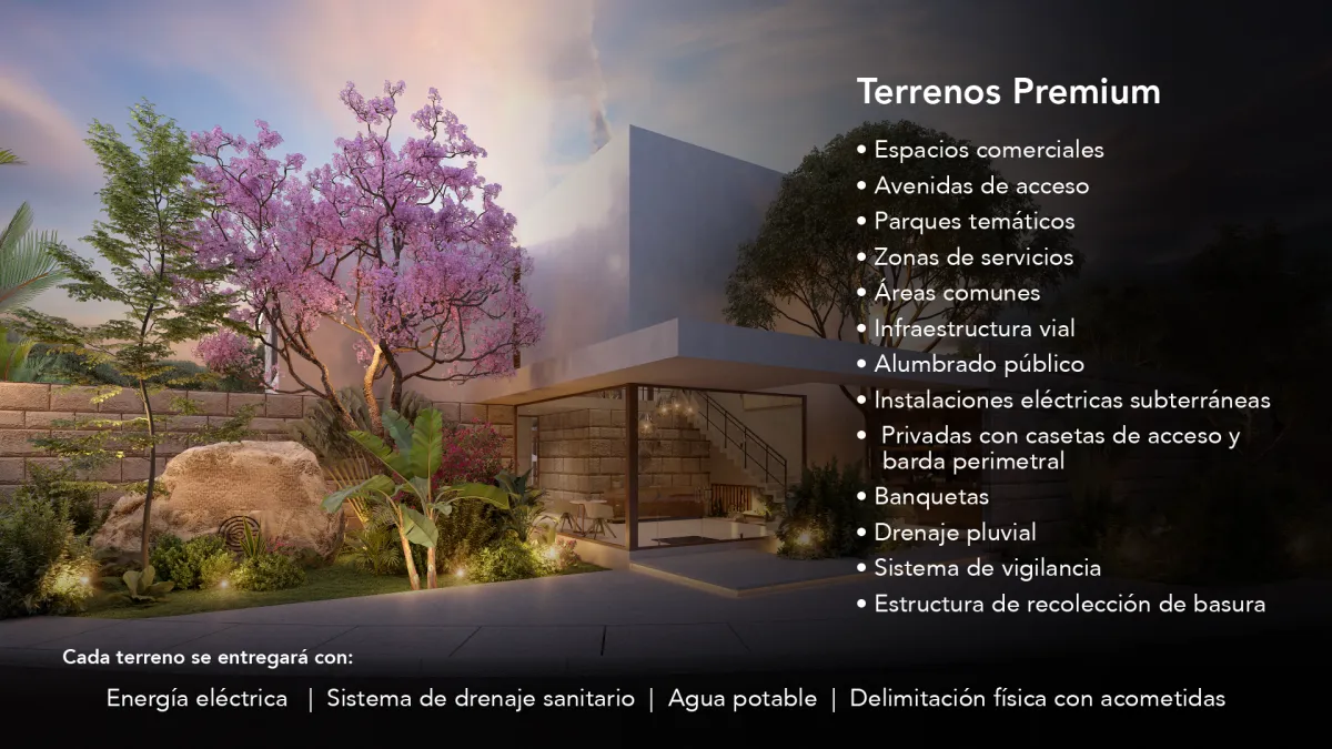 Infraestructura vial | Alumbrado público | Instalaciones eléctricas subterráneas | Privadas con casetas de acceso y barda perimetral | Banquetas | Drenaje Pluvial | Sistema de vigilancia | Estructura de recolección de basura